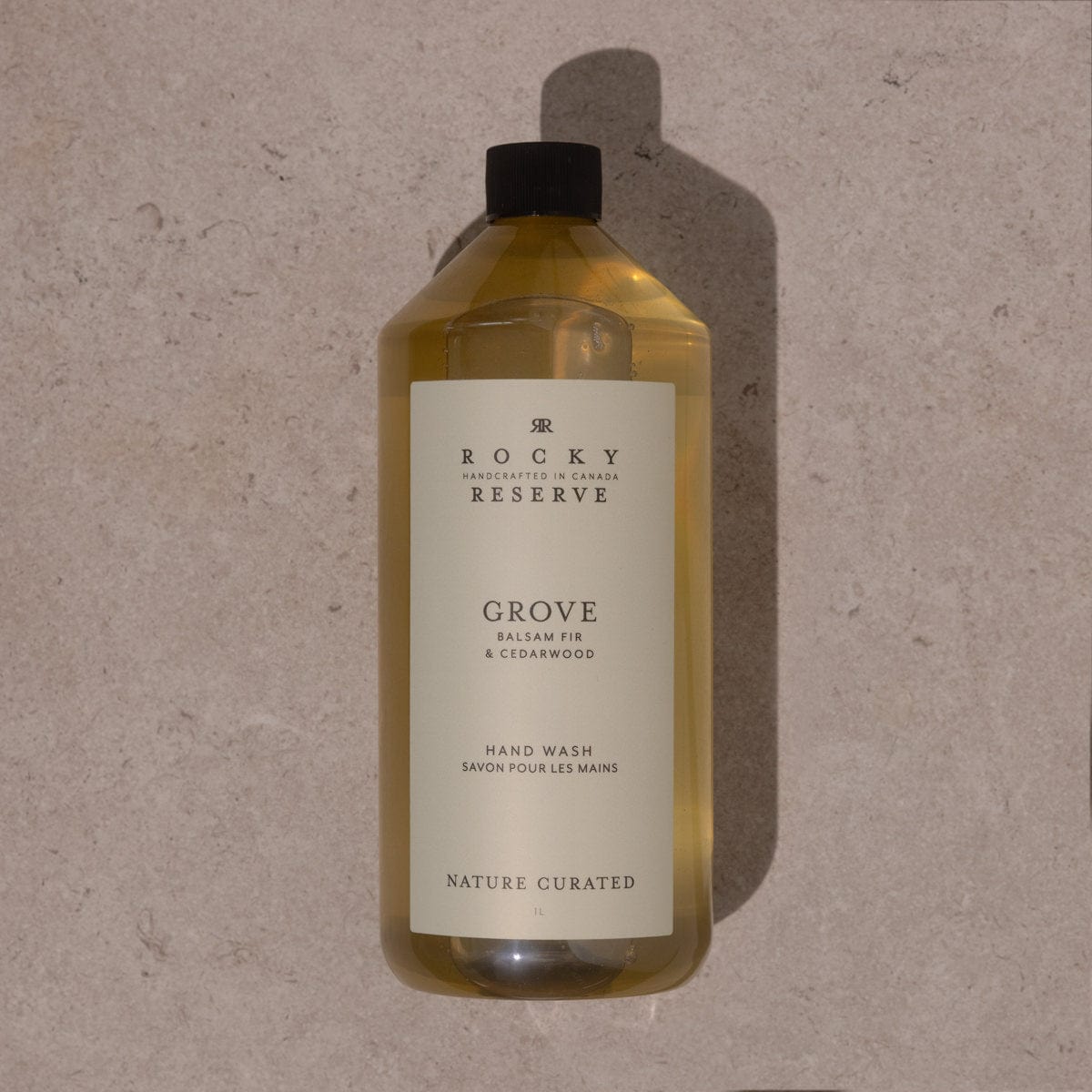 Our Rocky Reserve collection is presented in sophisticated, reusable amber glass bottles. Our 1L refill bottle and cap are made from 100% post-consumer recycled (PCR) plastic—which helps reduces single-use waste and is designed to use to refill your glass bottles again and again.