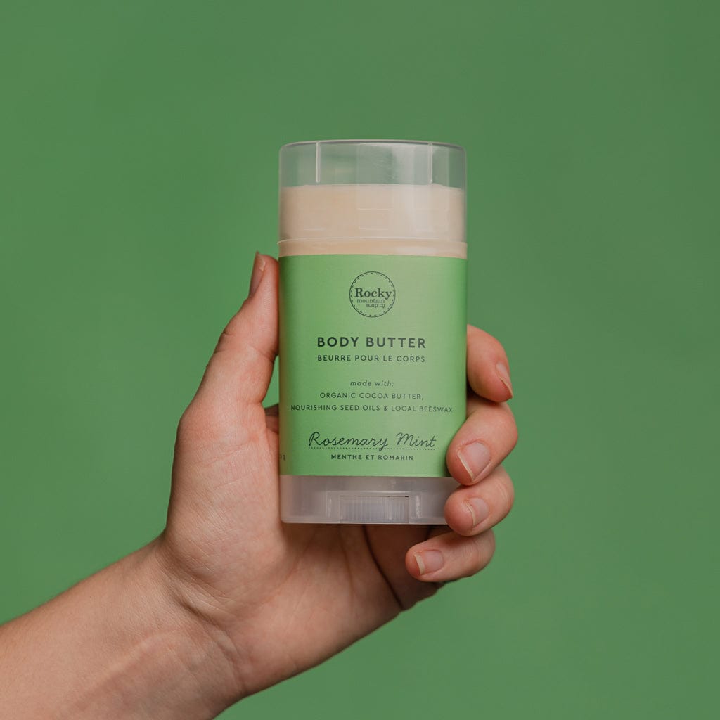 Rich, hydrating body butter in our new Rosemary Mint scent provides nourishing care for dry, stressed skin. Organic cocoa butter and seed oils soften the skin, while local beeswax helps to lock in moisture. Breathe in while you apply this rich butter to your skin and enjoy our invigorating new blend of balancing rosemary and bright peppermint.