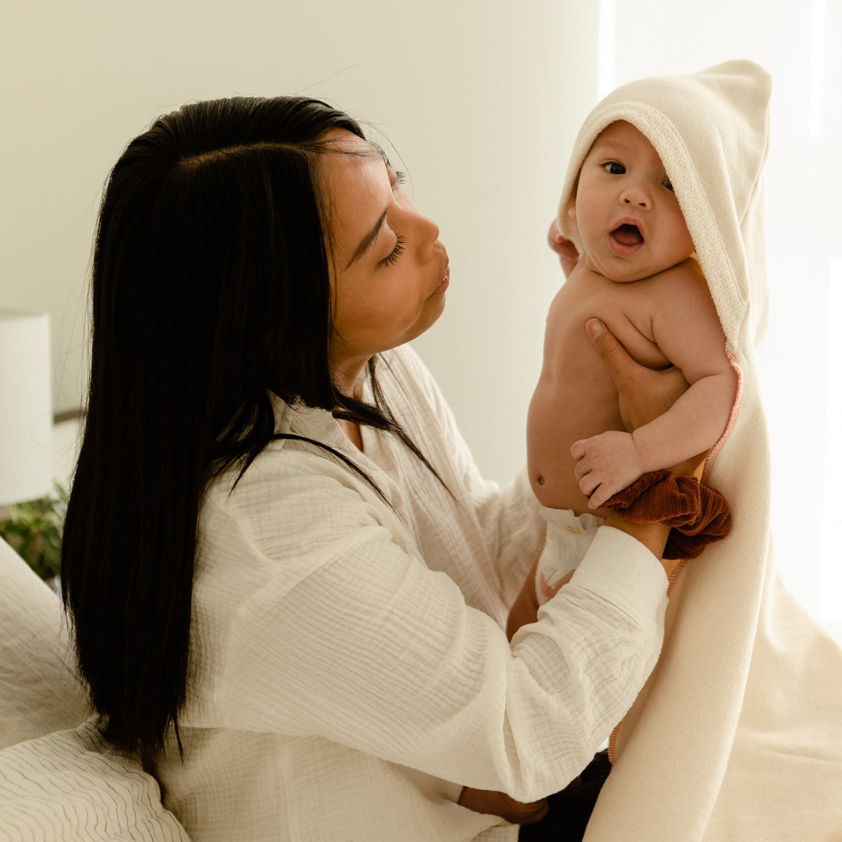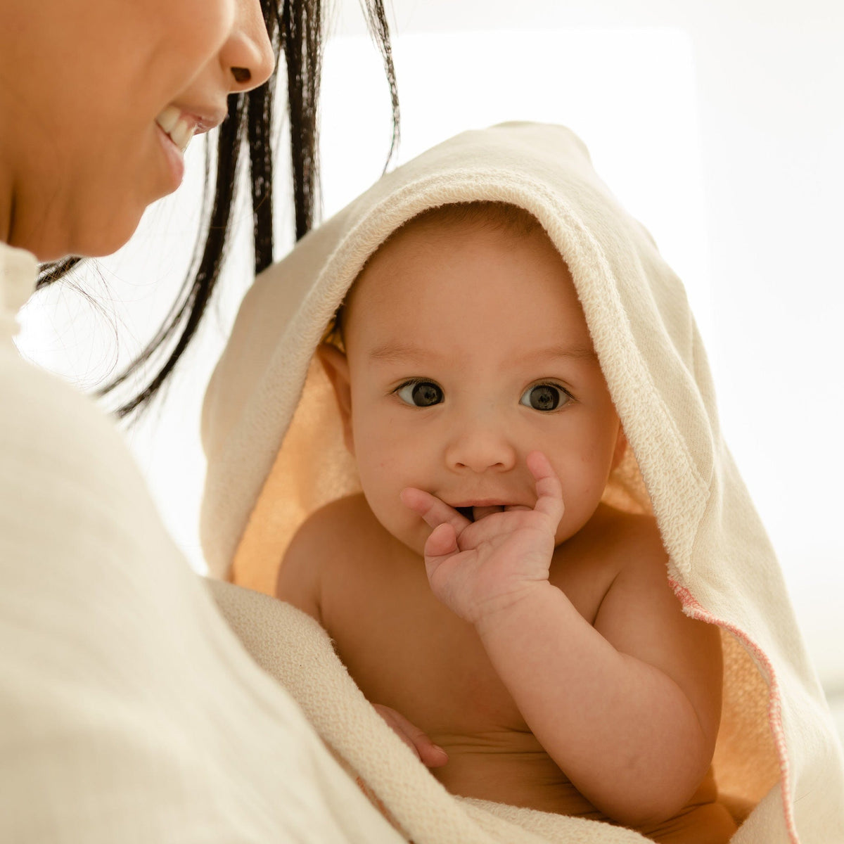 This French terry hooded towel that helps you bundle your little ones up in warm organic cotton comfort. Each towel was handmade in Ontario and everything from the fabric to the thread, ribbon and even the labels is organic. Snuggle them up, dry them off and then toss this towel right in the washing machine (on cold) for easy, fun bathing routines.