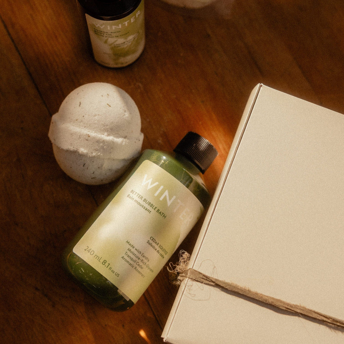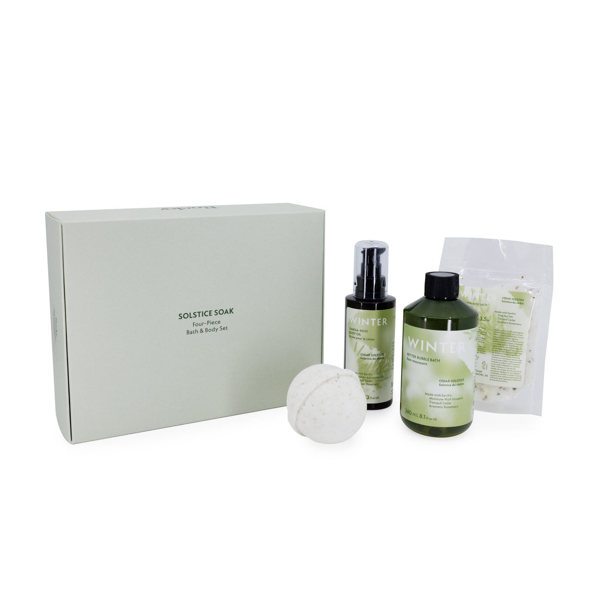 This is a set made for bathing season. Featuring all of our bathing essentials in our limited-edition Winter scent. Cedar Solstice is inspired by the forest, blending the rich, tranquil aromas of cedarwood with the fresh, aromatic notes of rosemary.