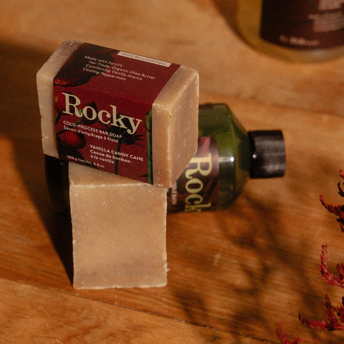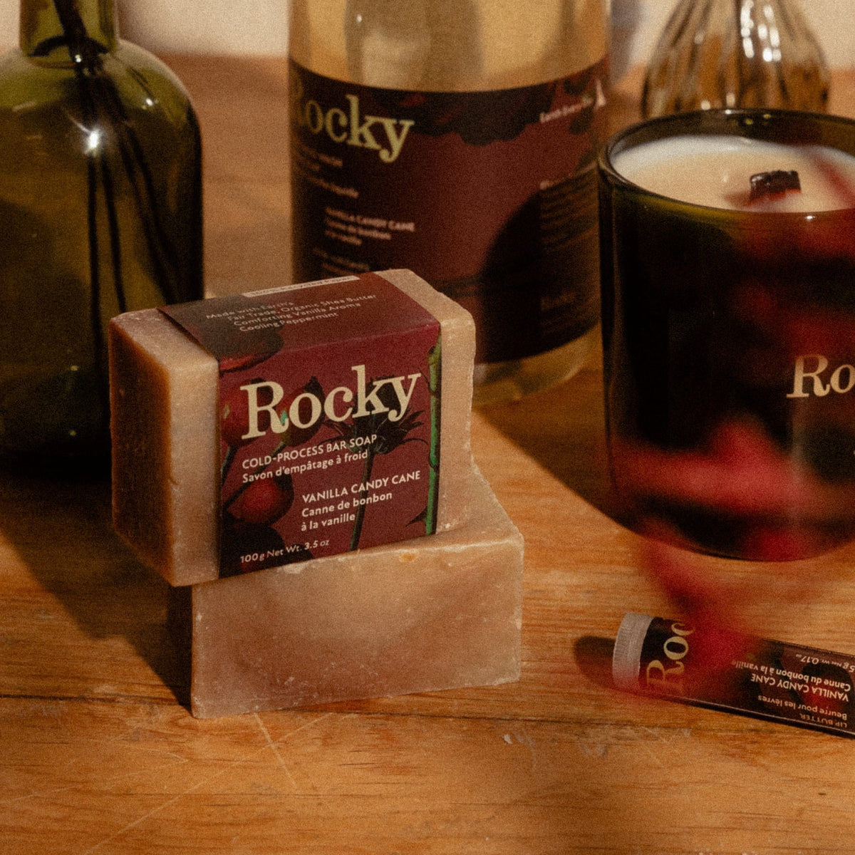 • A cold-process bar soap in our limited-edition Vanilla Candy Cane scent. Crafted from nature, this nostalgic holiday blend combines the refreshing coolness of peppermint essential oil with the comforting warmth of natural vanilla aroma. Each bar is made with our signature blend of shea butter, coconut, and olive oils to create a rich, moisturizing lather that leaves skin soft and refreshed.