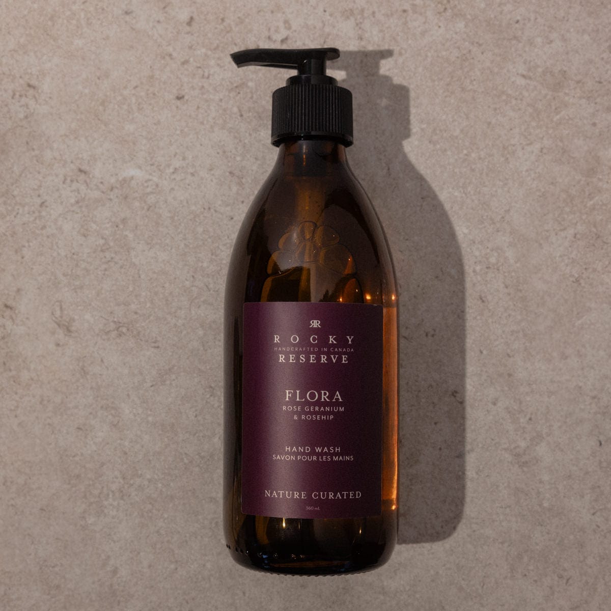• Flora Hand Wash: Apply one to two pumps of this nourishing liquid Castile soap and work into a lather with warm water.